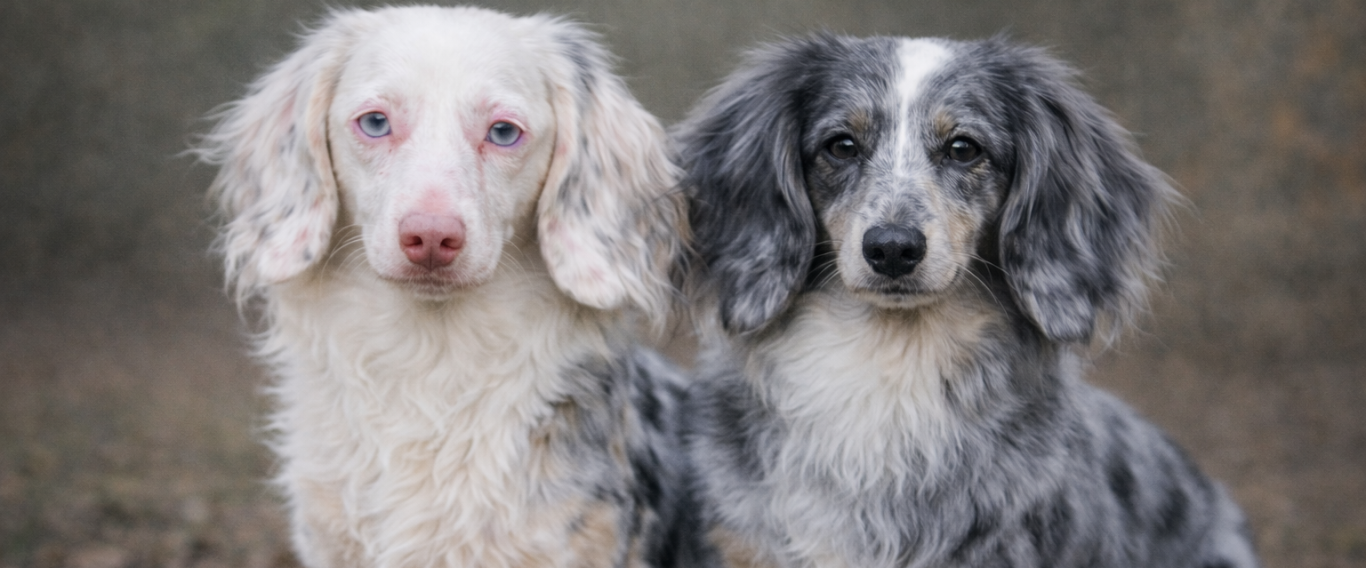 Ein Doppelmerle-Langkardackel entsteht, wenn zwei merlefarbene Dackel miteinander verpaart werden. Dabei verdoppelt sich das Merle-Gen, was gravierende Folgen hat.