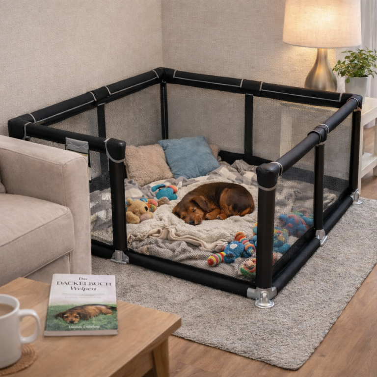 Zu Hause sollte der Dackelwelpe zunächst die Möglichkeit bekommen, alles in seinem eigenen Tempo kennenzulernen. Statt ihn durch die Wohnung zu tragen oder Besuch zu empfangen, ist Zurückhaltung sinnvoll. Zeige ihm seinen Schlafplatz, seinen Wassernapf und einen ruhigen Rückzugsort.